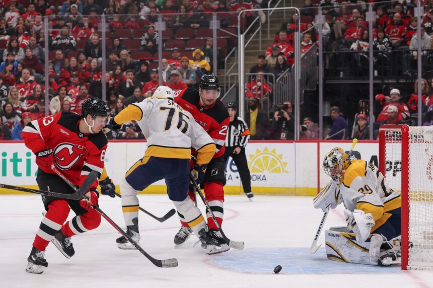 Nico Hischier wasted little time in overtime, scoring just 42 seconds in to give the New Jersey Devils a 3-2 victory over the Nashville Predators on Thursday night, even after Jack Hughes was forced to leave the game early.
